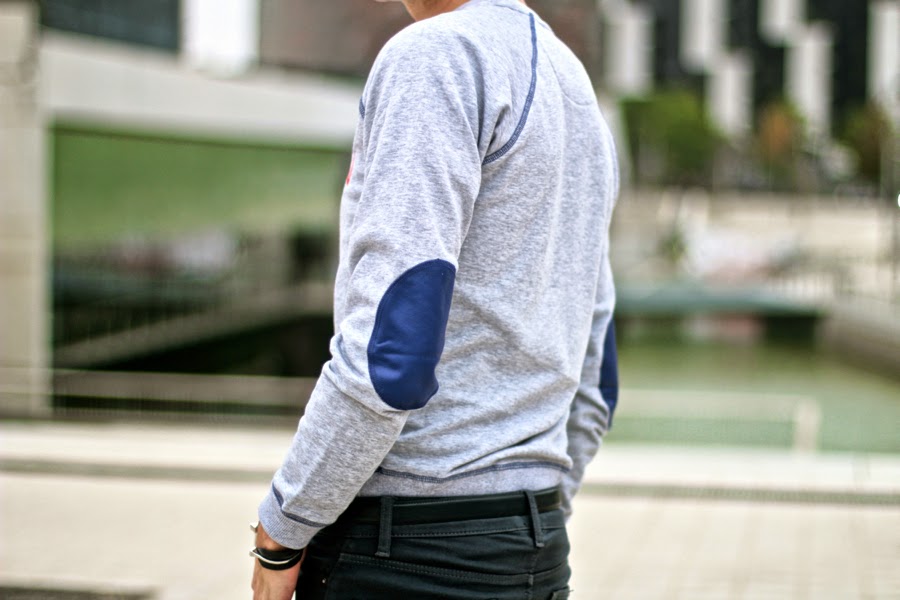 À peine revenu de New York j'ai embarqué pour Barcelone afin d'y rejoindre un ami en escale là-bas. À vrai dire, je suis allé plusieurs fois dans cette ville mais c'est toujours un plaisir de pouvoir y retourner comme il reste toujours quelque chose à voir. Tout a beaucoup changé depuis ma dernière venue et les travaux sont loin d'être terminés. Pour mes premières heures direction la Agbar Torre, sur l'Avenida Diagonal. Le béton, le verre et les sculptures contemporaines s'associent bien avec mon sweat-shirt Cavalier Bleu, que je me suis procuré juste avant mon départ, dans le pop-up store de la marque, situé au 15 rue des Blancs Manteaux dans le IVème arrondissement. Empiècements de cuir indigo et broderie rouge, il me le fallait ! Aussi, je l'ai déjà mis sur Instagram, je porte mon cadeau de « Saint Matthias », le bracelet Binôme de Hermès. Si l'on omet le bruit (incessant) des travaux, ce spot est vraiment parfait, pour flâner un peu.