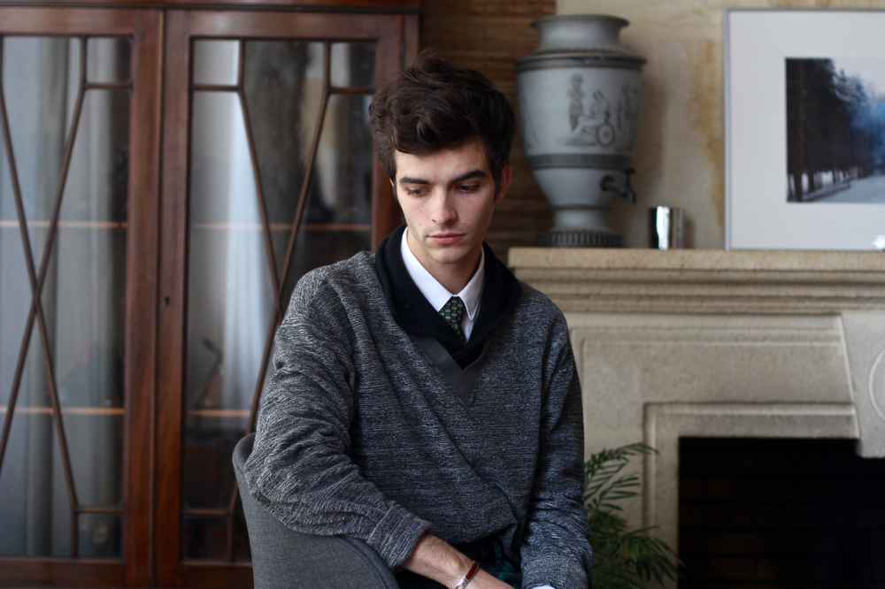 décontextualisé avec un pull en éponge et un slim vert délavé.