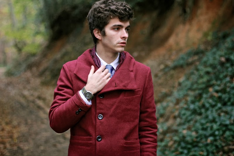 Today I show you the second coat that I mentioned in my precedent post. As I have already many dark models I preferred choose this burgundy one with an asymmetrical buttonhole. To fit my classical mood, I wear an embroidered tie.