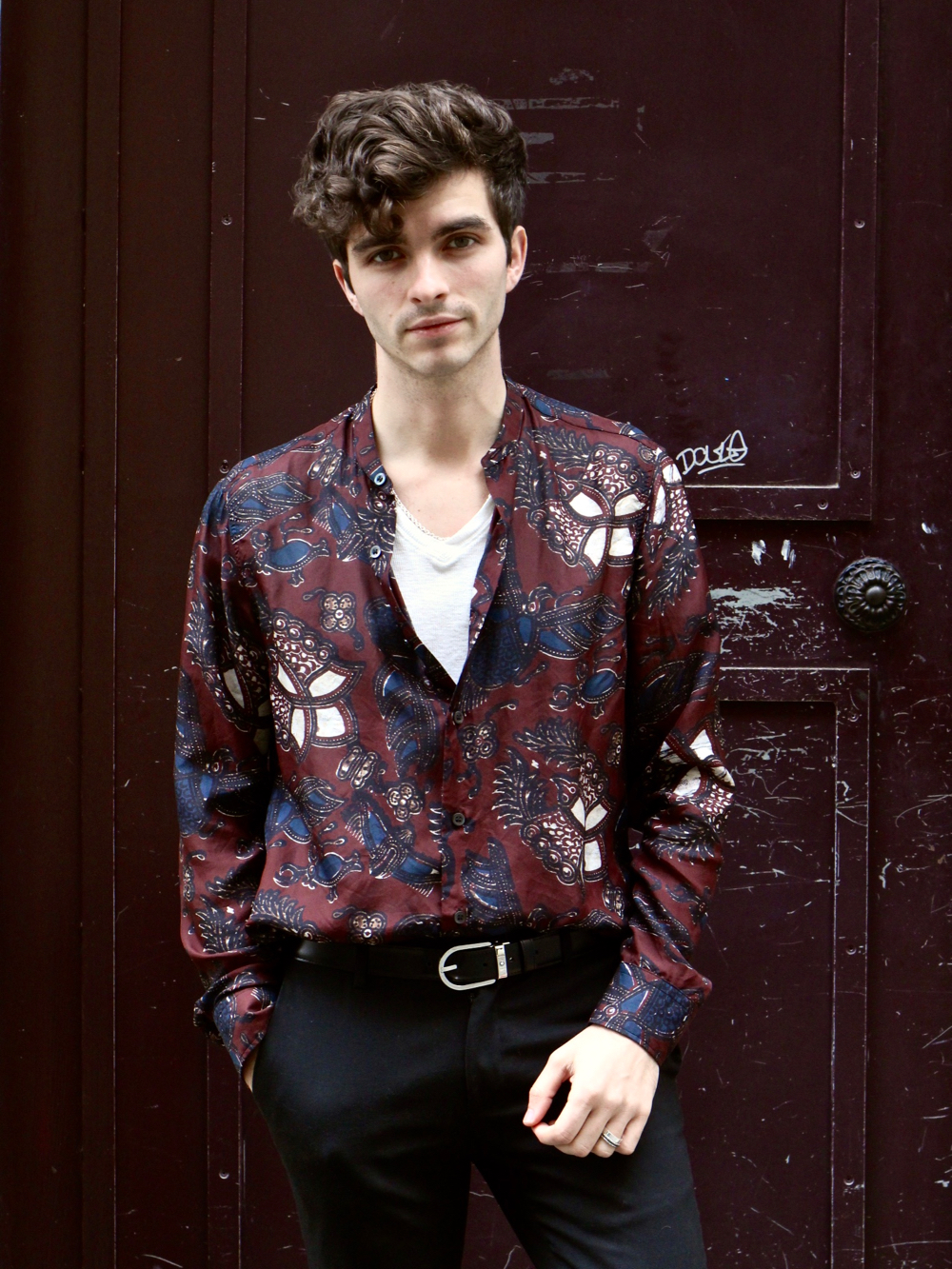 J’ai superposé mon manteau Agnès b. et cette chemise Dries Van Noten afin de créer un double contraste de motifs - ethnique et pieds de coq - et de matières - soie et laine. Le résultat est somme toute assez élégant mais surtout original donc pour le reste je suis resté plutôt sobre en optant pour un pantalon à pinces et des derbys noirs que vous connaissez par coeur maintenant.
